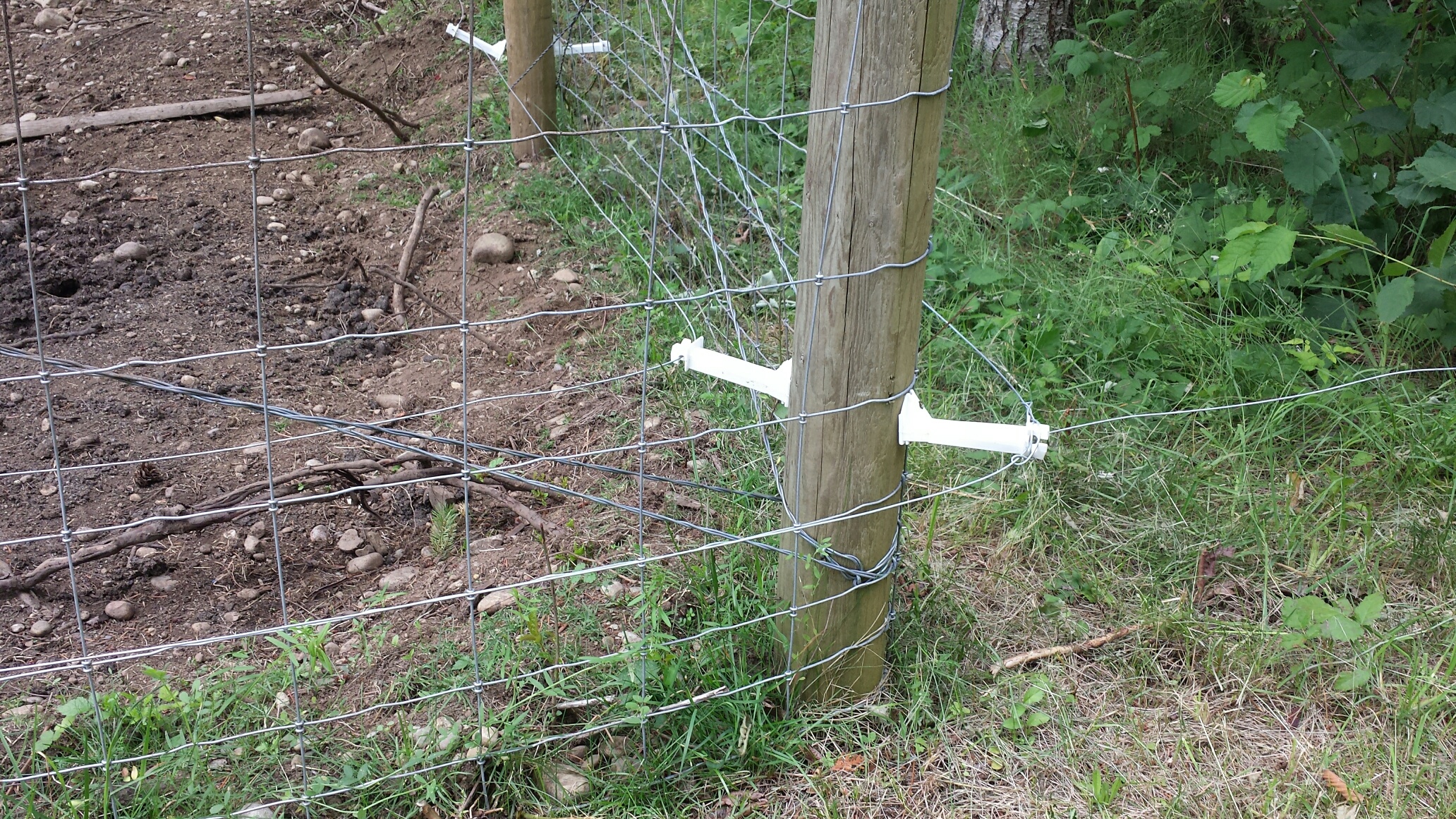 Smooth horse wire works well for bracing wire and you can use pieces of lumber, or as we do here, cut up stout cedar limbs for winders to tighten the wire.  Use heavy 10 inch nails to fasten the horizontal blunt brace posts. Stretch the 4 ft Red Brand field wire between brace posts and use 6 ft metal T posts every 8 ft in between.  Attach the hot wire, turn it on and youʼre ready to sleep well at night with a reasonable assurance that you can be sparred those midnight dead runs…