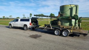 I have this 18-foot flatbed trailer… but it’s of the car hauler variety which has caused me an unreasonable amount of grief in all the years I’ve had it… it’s the fenders, see… makes it tough to get anything on or off of that dead zone between the fenders. Animal raisers, hay handlers, grain haulers take note: Don’t get the fenders! So, the fender grief began anew… Old Floyd, the once proud owner of the green mini monster with seemingly one or two augers on each side, judiciously measured every angle of the big Green Machine and reported these figures to me before the journey… ok, with the tires off it was 76 inches wide which would fit nicely between the 81 inches that exist between those fenders. Well, upon rolling into the Floyd compound I could see it right off… there was no way that thing was going onto my trailer. Sure enough, the unit turned out to be about 86 inches wide hub to hub with the wheels off. Here I was 1,300 miles from home for only one reason… to pick up this big steel tub full of augers… and it wasn’t going to go on my trailer!
